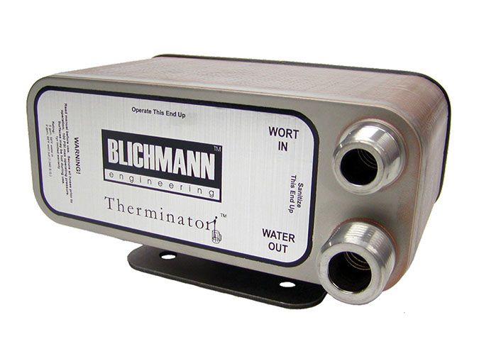 The Blichmann Therminator Wort Chiller is one of the most popular tools to use when chilling your wort, as it gets the job done quickly, effectively and without much effort from you. This particular chiller has 40 plates and 316 stainless steel plates and fittings. It features ½ inch MPT for the wort in and out, and a ¾ inch MPT garden hose thread for the water in and out. You’ll be able to chill just like the pros when you use the Blichmann Therminator Wort Chiller, as it is extremely similar to the chillers used in commercial breweries.,The Therminator chiller is small but mighty, with the capability to chill 10 gallons of wort down to 68 degrees when using 58 degree water in just five minutes! It measures an ultra compact 7.5 inches wide, 4 inches deep and 3 inches high, which also makes it very easy to clean and sanitize. It is brazed together with pure copper in an oxygen-free furnace so there are no potential leaks, and it even comes with heavy gauge stainless mounting bracket to keep your system looking sturdy and seamless. , ,,,All 316 stainless steel plates and fittings.,,,Chill like the pro's - Identical to commercial brewery chillers.,,,Brazed together with pure copper in an oxygen free furnace - no potential leaks like a gasketed unit.,,,Chill 10 gal in 5 min to 68°F using 58°F cooling water at 5 gpm.,,,Ultra compact (7.5" W, 4" D, 3" H),,,Easy to clean and sanitize - small enough to boil!,,,Garden hose thread connections on water side - no extra adapters to buy.,,,1/2" male NPT fittings on wort side mates up with virtually all common hose connector types. Much easier to sanitize than female fittings.,,,Comes with heavy gauge stainless mounting bracket