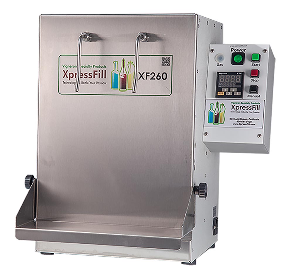 Help eliminate oxidation in your bottling process by using XpressFill volume-based filling system!,Gravity-based systems usually involve wine being transferred to a holding tank, and unless the your bottles and holding tank are pre-flushed with inert gas, some degree of oxidation is inevitable. Xpresfill bottling systems have a closed pathway with a self-priming pump. They also have as an optional built-in sparging (pre-flushing) system that uses Nitrogen or Argon to pre-flush your bottles.,To use, place two bottles under the filling spouts, push the gas button (optional at addtional cost) to flush the bottles with inert gas. Then hit the Fill button which pulls the wine from your barrel or stainless storage tank, distributes 750ml of wine to each bottle, and shuts off automatically when done. It is truly that simple. Each fill cycle lasts 20 seconds. Realistically with bottle movement (and talking and drinking!) expect to fill about 200 bottles per hour with the 2 spout and 400 bottles per hour with the 4 spout. There is also a manual mode allowing you to top up bottles or fill odd size bottles (connect tubing and fill magnums for example.),You my have seen this system for sale before as the Vigneron. Xpressfill purchased Vigneron and redesigned the unit to be driven by a digital controller. The result is a unit that works much better. MoreWine! has tested the unit and we are happy with the performance.,The XpressFill is a a volume based system that fills each bottle with a set volume of wine (usually 750ml per bottle.) The fill is accurate to within +/- 1.5ml. However, bottles themselves can vary in volume by a couple percent and when you are filling by volume this can result in different fill heights, especially if you fill into the bottle neck, where differences are exaggerated by the small diameter of the neck. Fill heights will therefore vary from bottle to bottle but differences are usually 1/2" or less.,The two spout filler features a 3/8" inlet.,Further protect your wine from oxidation when using an Xpress Fill by adding the Gas Flush option to your filler. Push the gas flush button for as long as you like prior to each fill cycle. Inert gas will be forced into the bottle displacing most air, greatly reducing oxidation during the bottling process. You will need to supply an Argon or Nitrogen tank, regulator, and section of 1/4 in. tubing to connect an inert gas source to the machine.